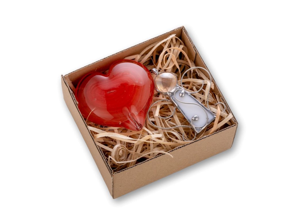 Dárková sada, složená z červeného skleněného srdíčka a vitrážky anděl.