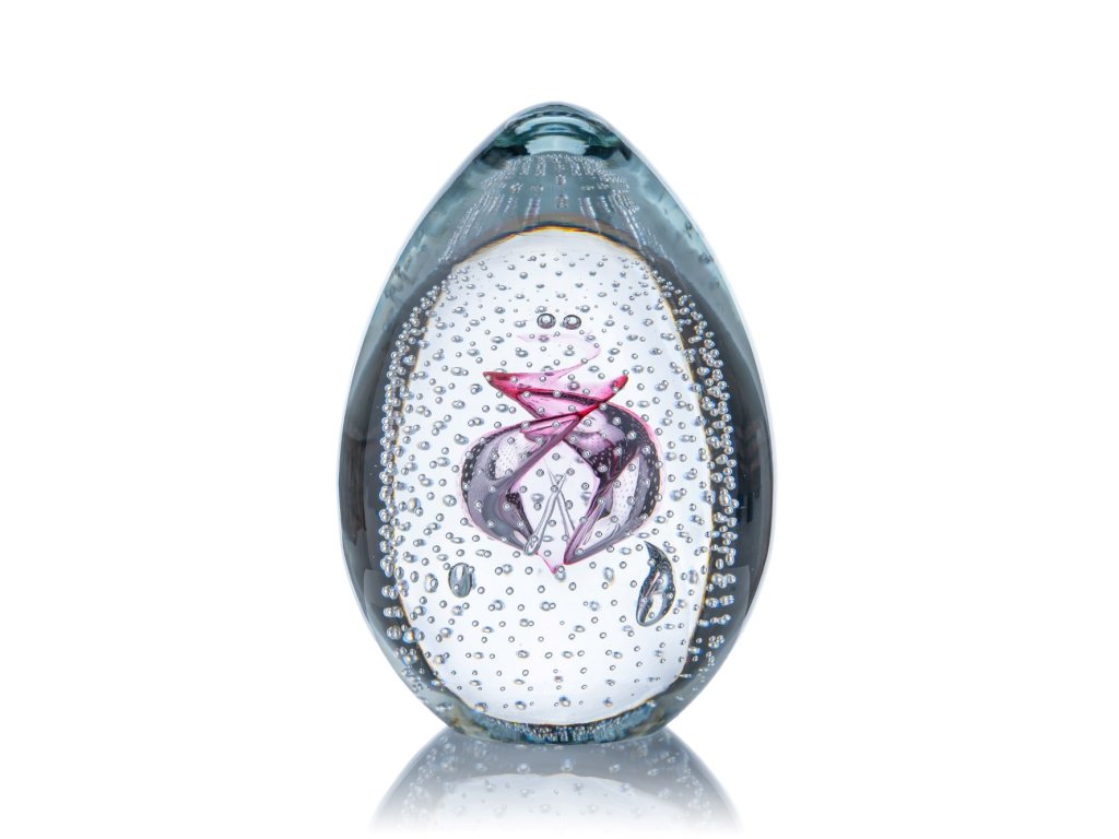 Skleněná dekorace ve tvaru vejce s drobnými křišťálovými bublinkami uvnitř skla je dokonalým doplňkem pro vaše interiéry. Tato elegantní a kouzelná dekorace dodá Vašemu domovu nádech elegance a moderního designu.
