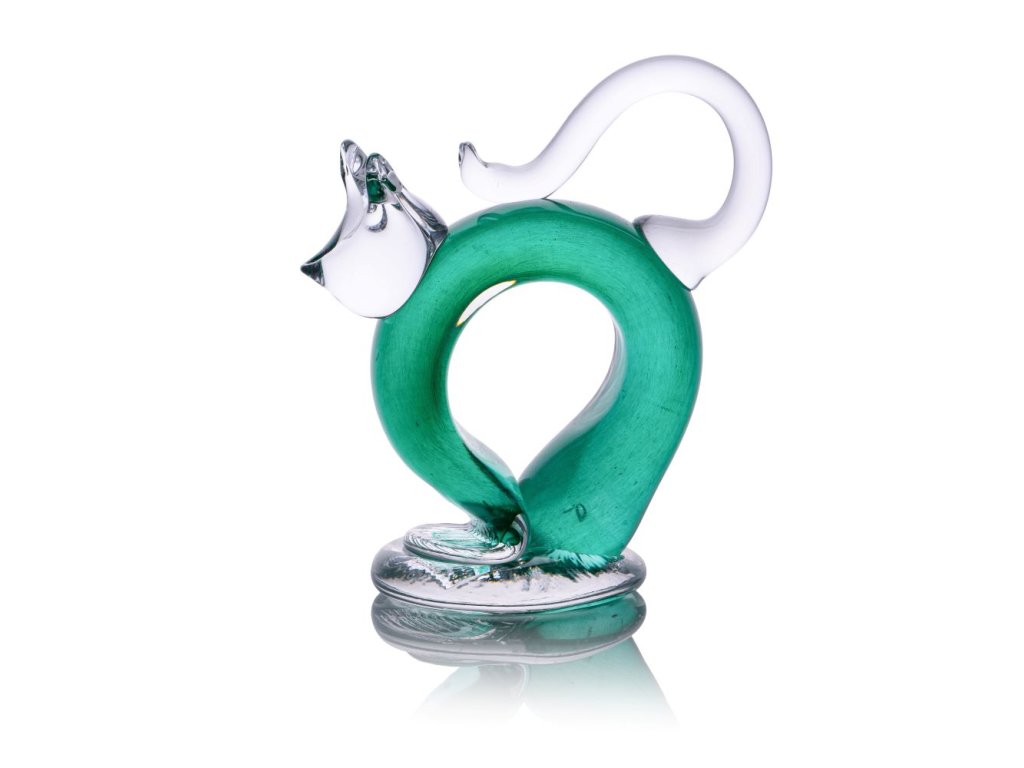 Skleněná, ručně tvarovaná kočka z hutního skla.