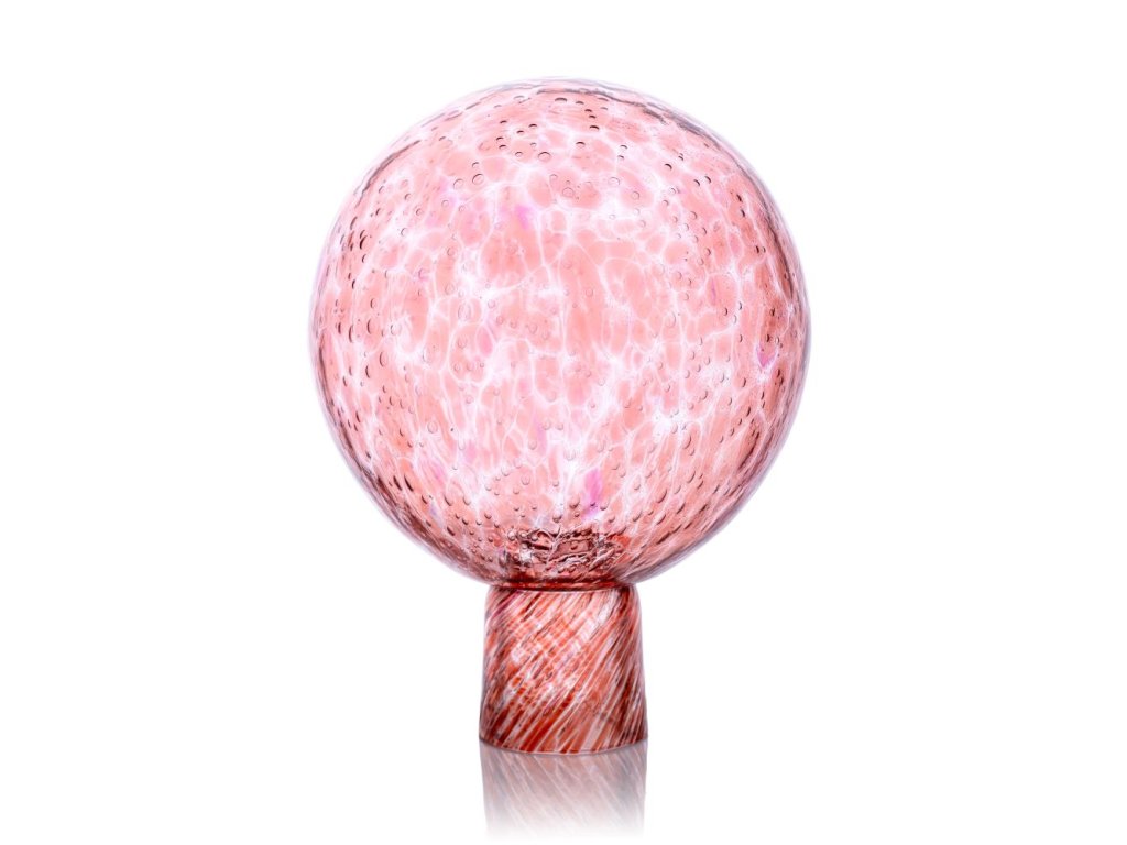Skleněná koule na plot (Plotová koule) v růžové barvě sypaná sodou, která ve skle dělá nepravidelné bublinky.