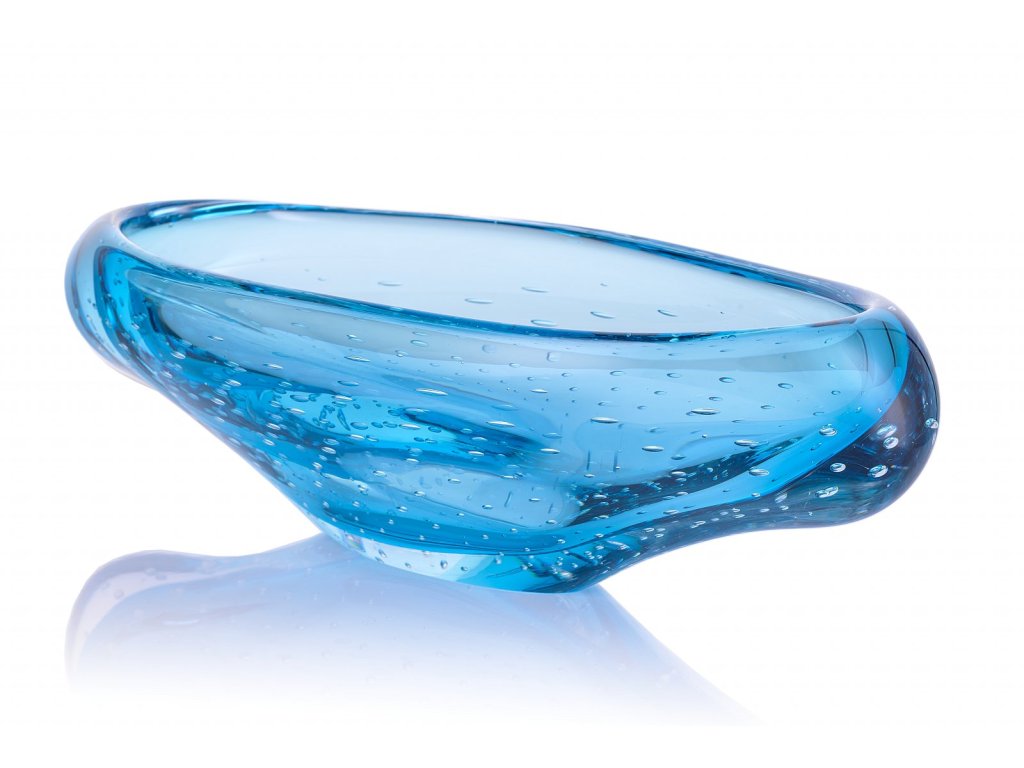 Skleněná mísa, ručně tvarovaná v jemné tyrkysové barvě s drobnými bublinkami uvnitř.
