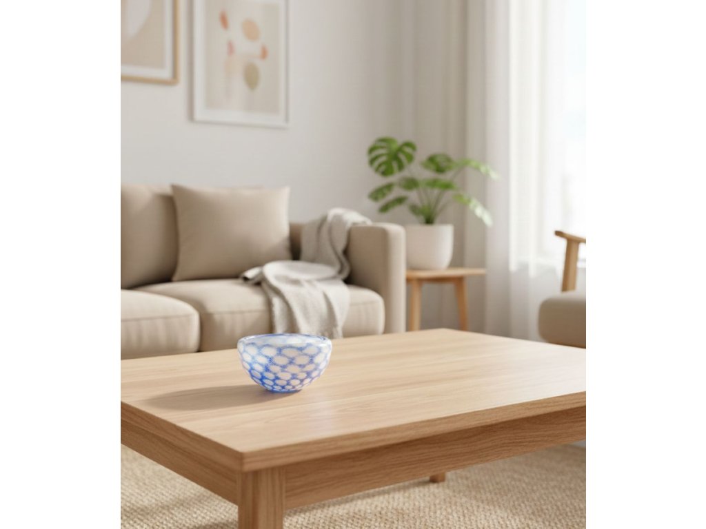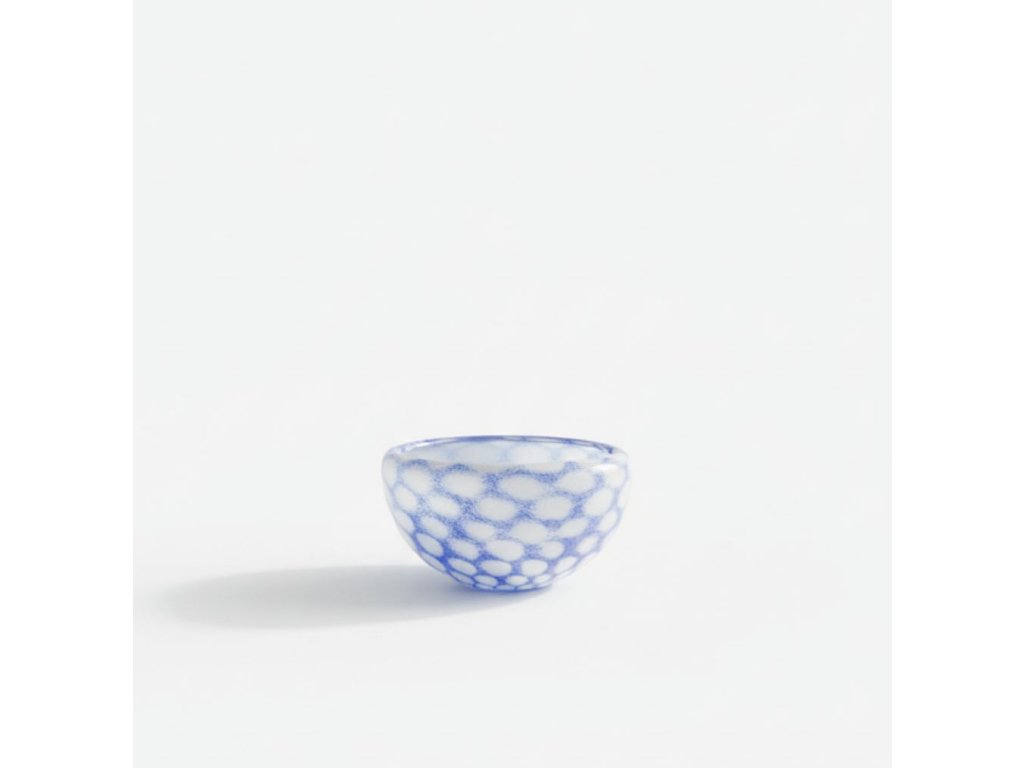Skleněná, ručně tvarovaná miska v bílo modré barvě.
