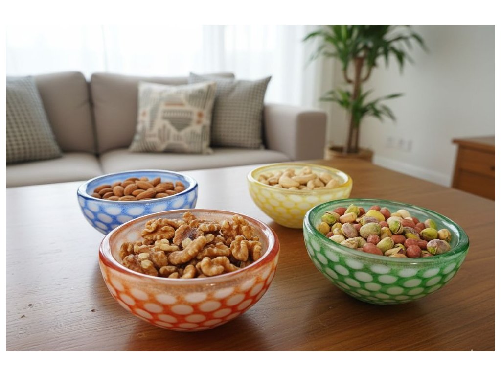 - Skleněné misky jsou velmi všestranné a mohou být použity na různé účely. Můžete je použít jako dekorativní prvky, ale také pro servírování oříšků nebo na ovoce, sušenky.