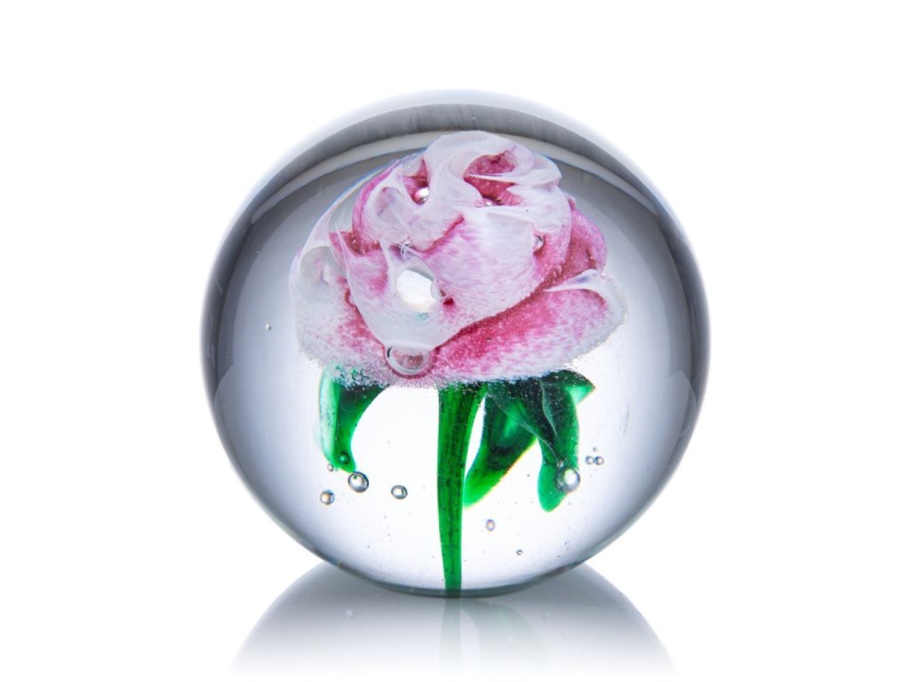 Skleněné, ručně tvarované těžítko z hutního skla s růží.
