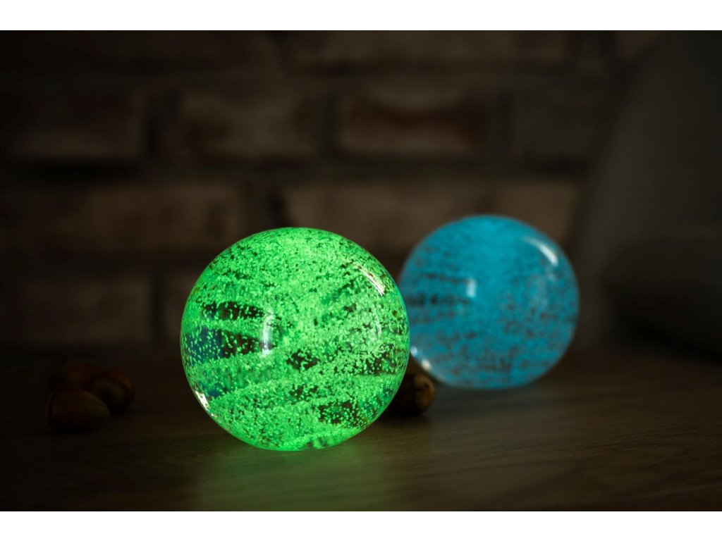 Skleněné těžítko s fluorescenčním pigmentem, který reaguje na okolní světlo.