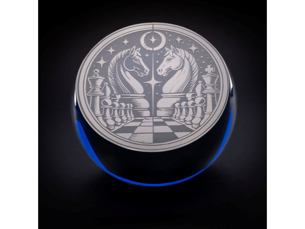 V každém detailu je zachycena esence šachové hry – napětí, taktika a rozhodující tahy, které mohou změnit výsledek. Modré sklo, které jemně odráží světlo, dodává tomuto těžítku sofistikovaný a moderní vzhled, zatímco pískovaný šachový motiv přináší do vašeho prostoru kousek klasické elegance.