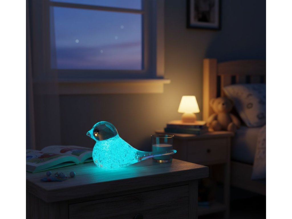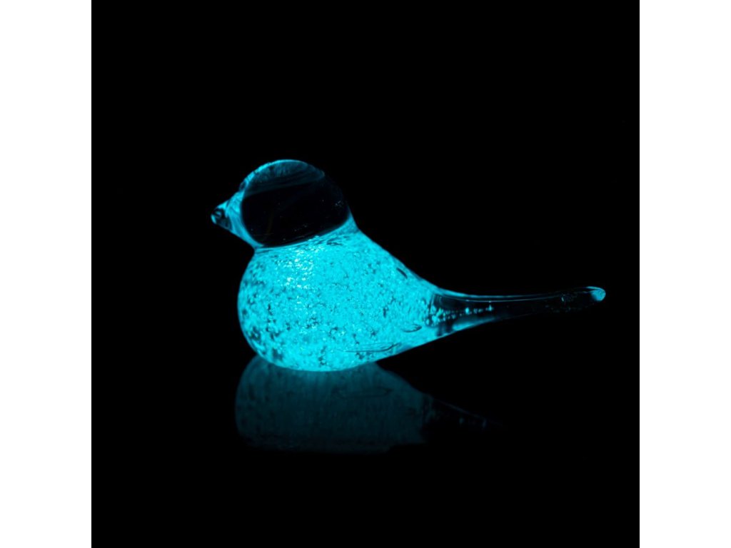 Skleněný, ručně tvarovaný ptáček s fluorescenčním pigmentem, který po nasvícení ve tmě svítí.