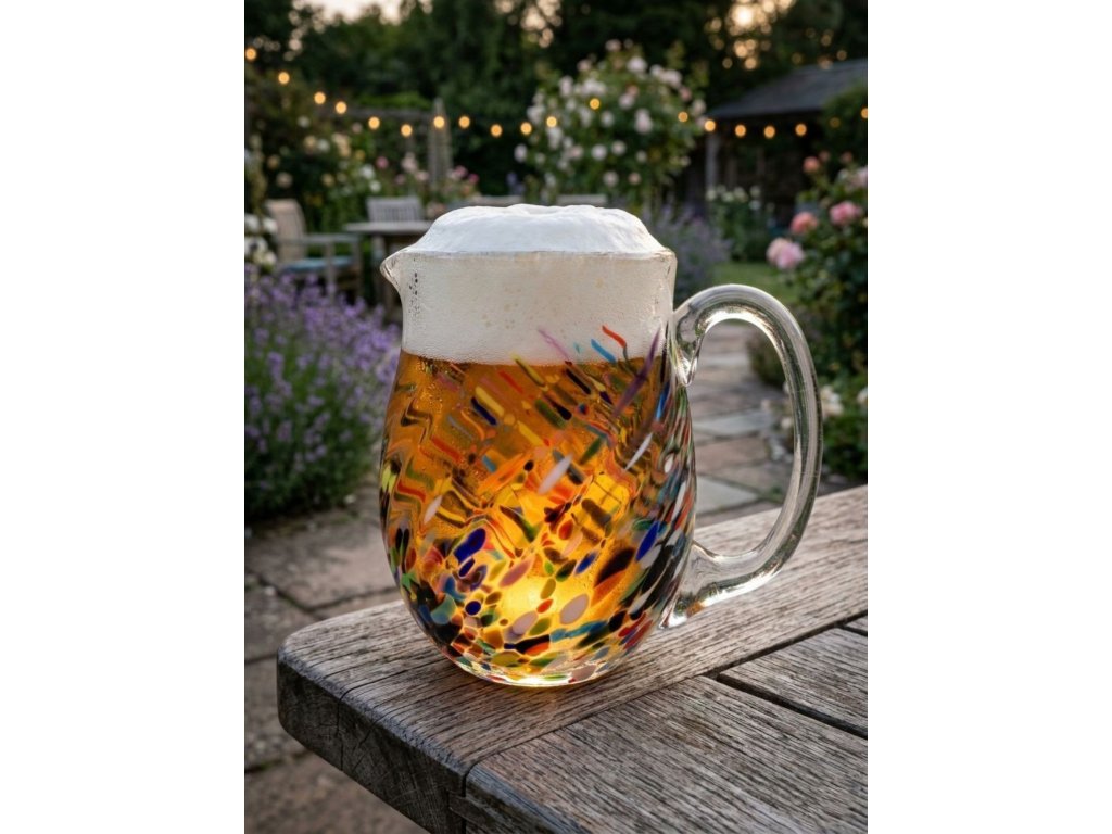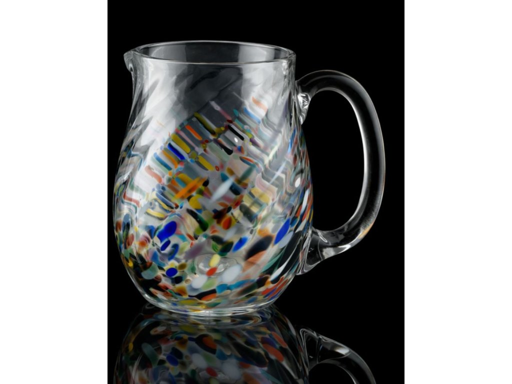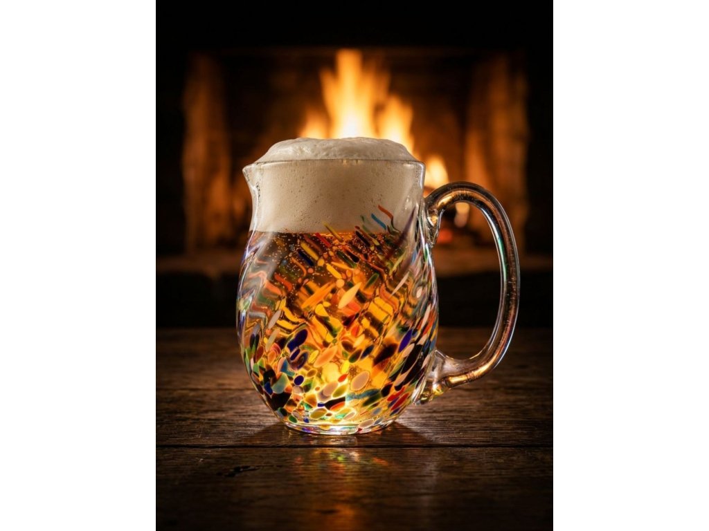 Originální skleněný, ručně tvarovaný půllitr z hutního skla se zapalovaným hrdlem a jemným optickým vzorem a sypaný jemnou sodou, která dělá ve skle nepravidelné bublinky.