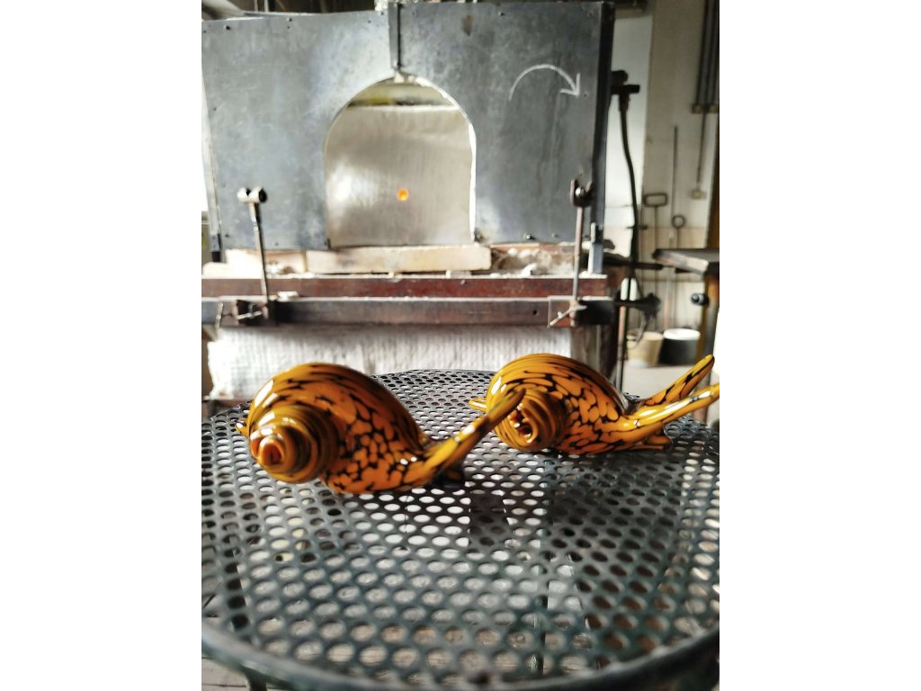 Skleněný šnek, ručně tvarovaný v černé barvě s oranžovými broky
