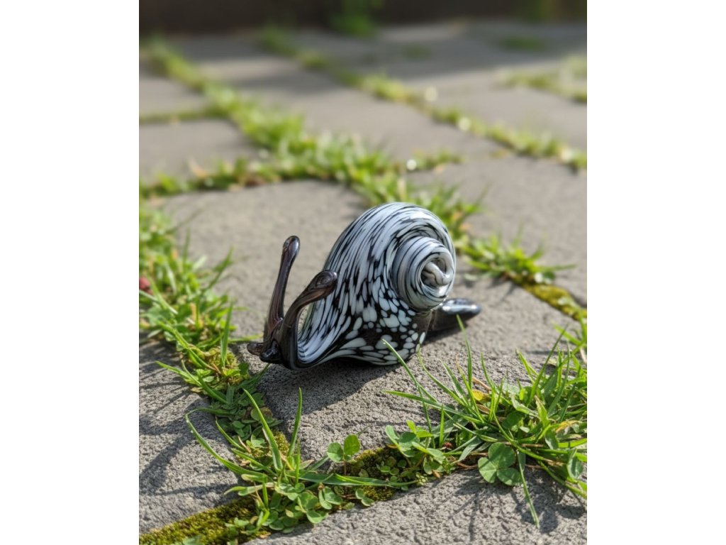 Skleněný šnek, ručně tvarovaný v černé barvě s šedými bročky.