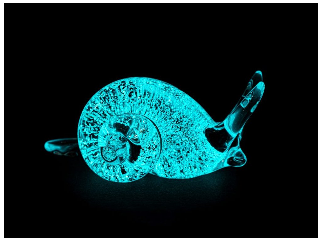 Skleněný, ručně tvarovaný svítící šnek s fluorescenčním pigmentem