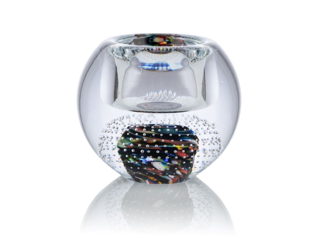 Skleněný svícen na čajovou svíčku s drobnými bublinkami uvnitř,