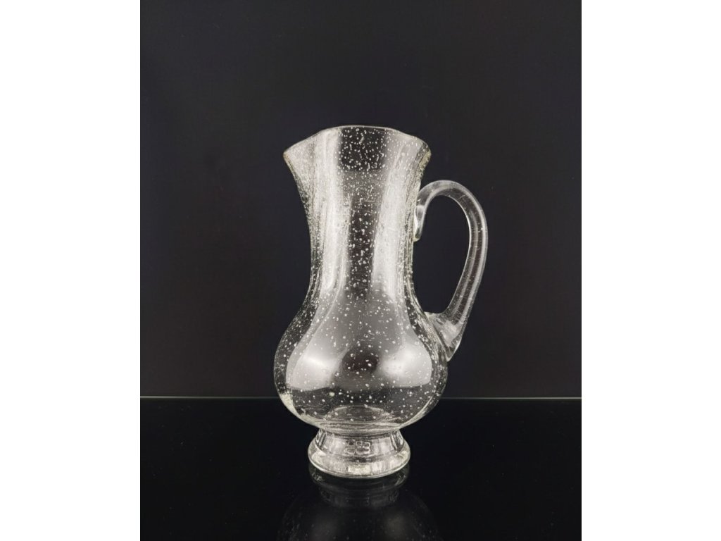 Ručně vyráběný skleněný džbán, který po nasvícení svítí modře s jemným optickým vzorem.