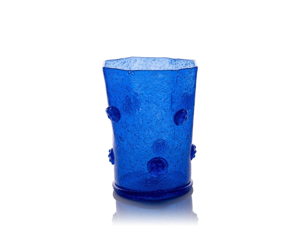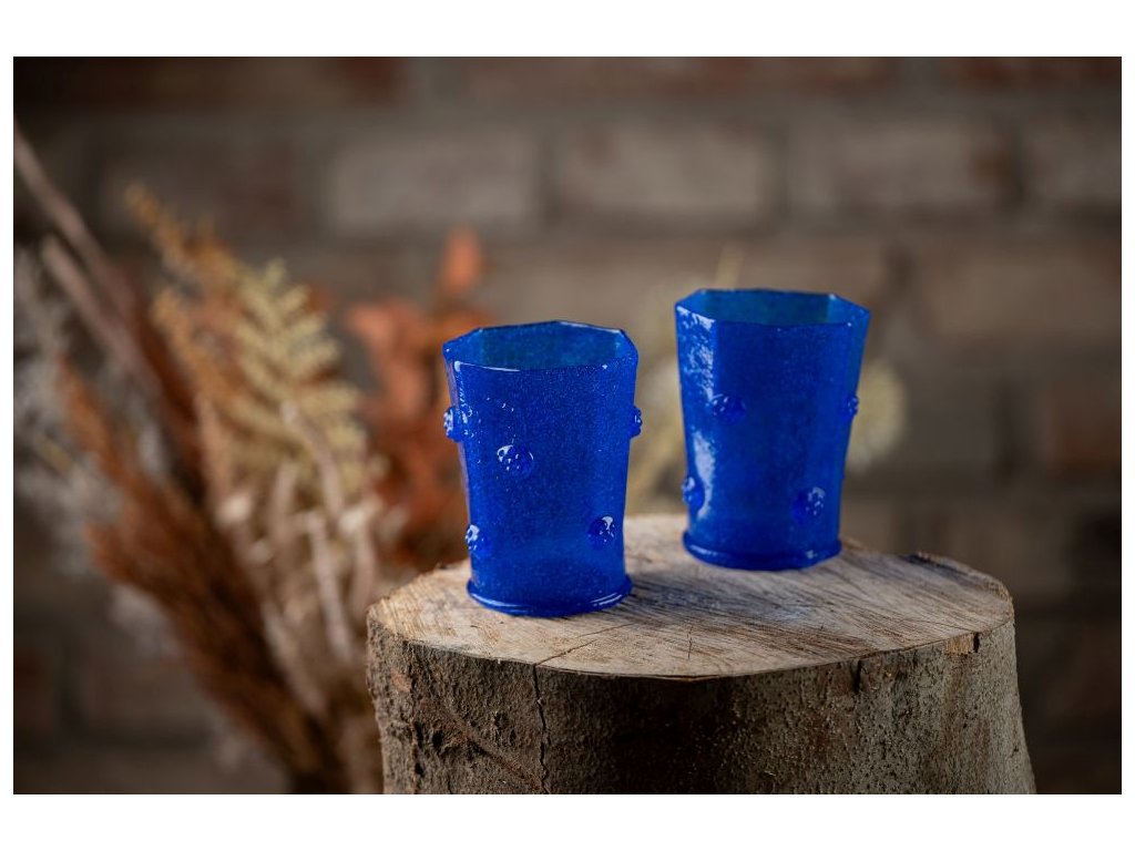 Vychutnejte si jedinečnost v každém doušku s těmito sklenicemi, které byly vytvořeny v mobilní sklářské peci. Jejich hluboká tmavě modrá barva a drobné nepravidelné bublinky uvnitř skla připomínají kouzlo noční oblohy a dodávají každé sklenici působivý historický nádech.
