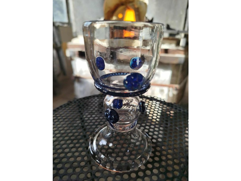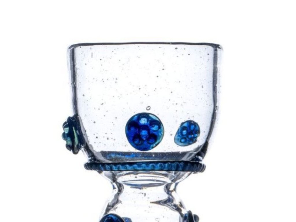 Ručně tvarovaná sklenice s dutou stopkou v barvě křišťál s modrými nálepy
