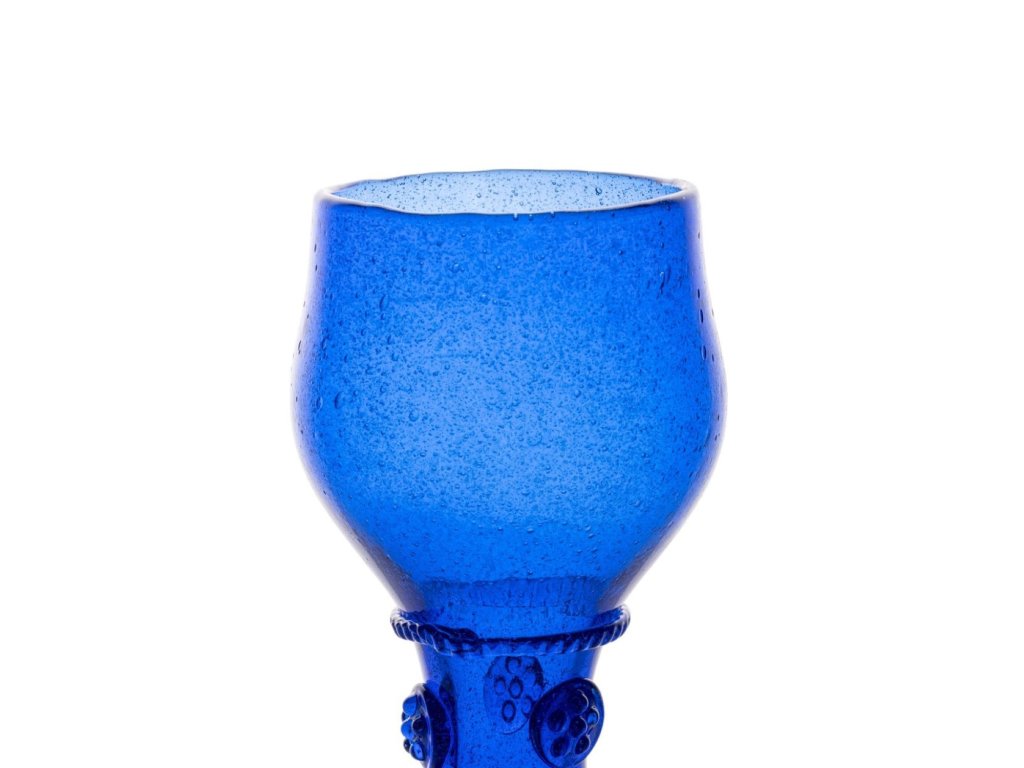 Vyzdvihněte své stolování na novou úroveň s těmito jedinečnými sklenicemi na víno, které byly vytvořeny v mobilní sklářské peci. Jejich hluboká tmavě modrá barva a drobné nepravidelné bublinky uvnitř skla připomínají tajuplnou noční oblohu a dodávají každé sklenici autentický historický nádech.